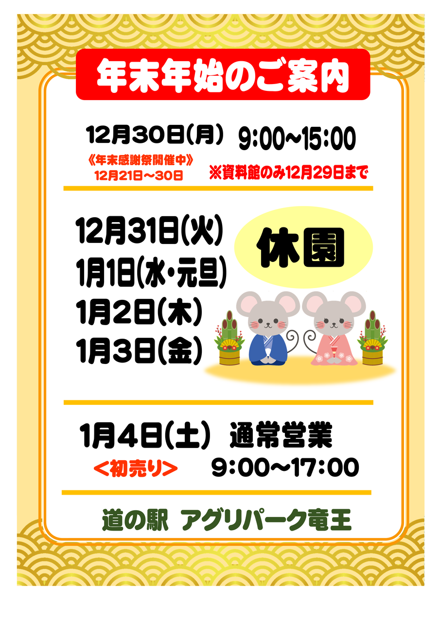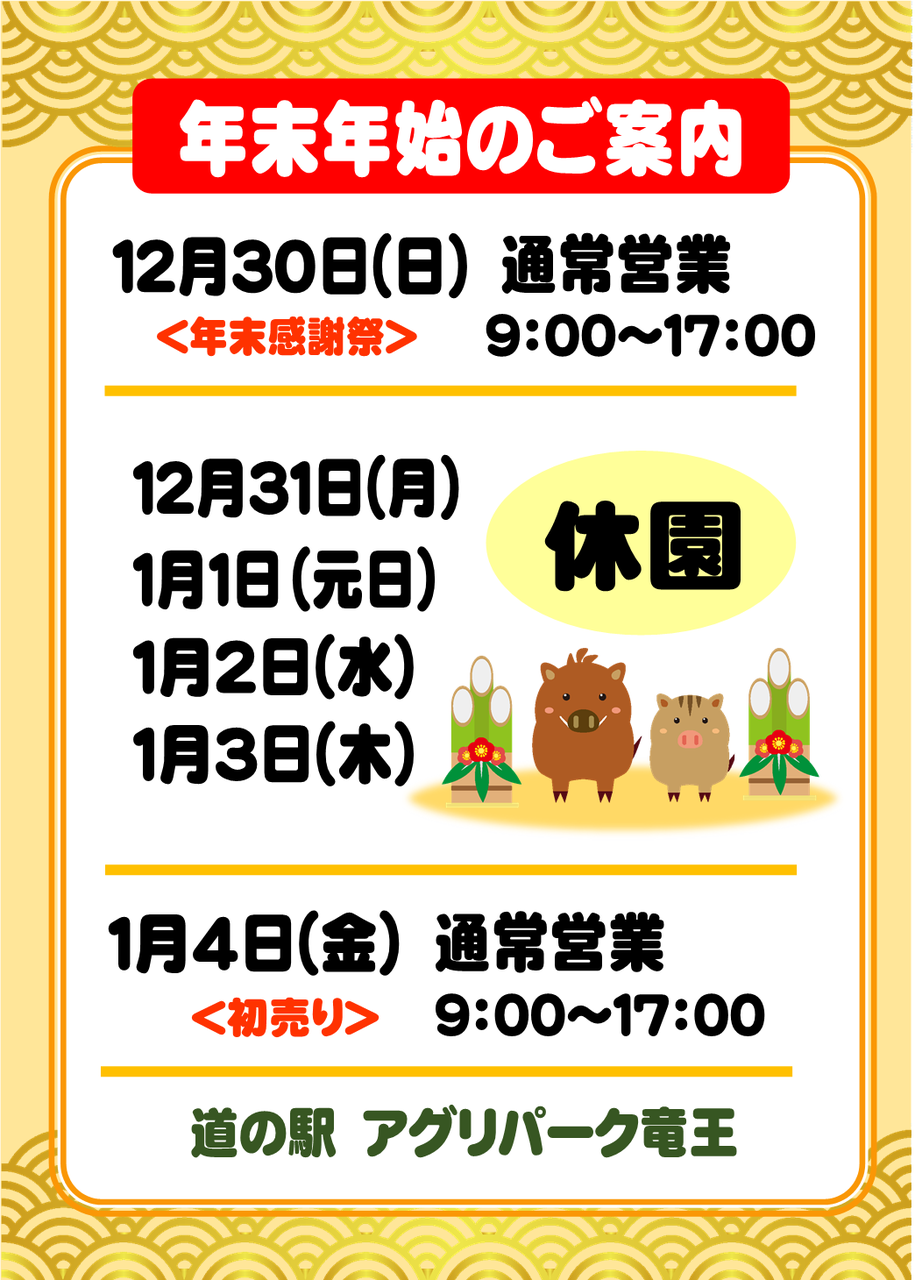 年末年始営業時間のお知らせ 道の駅 アグリパーク竜王ワクワク体験案内