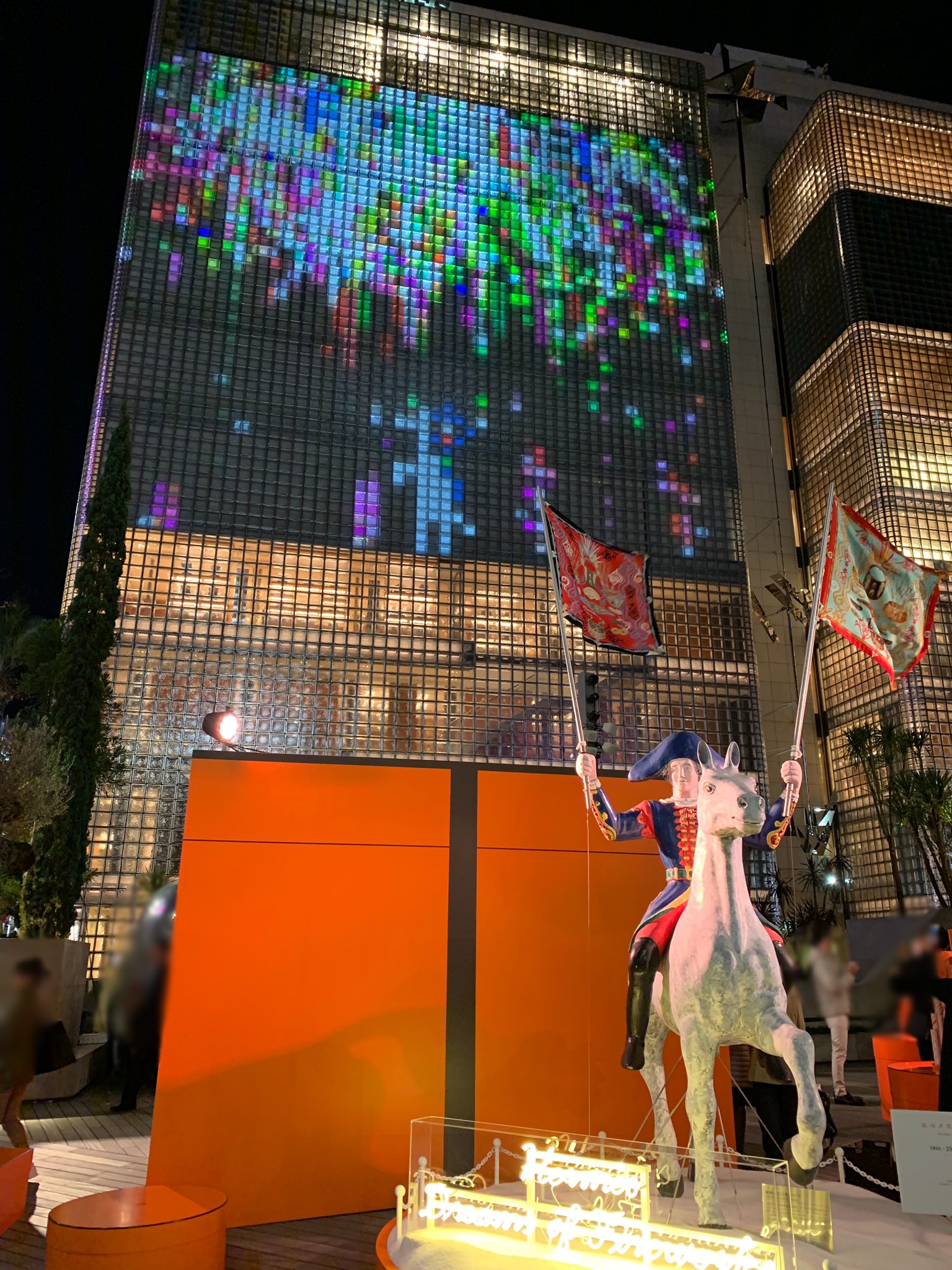 Dragon Pa Twitter 銀座ソニーパークで開催中の エルメスの夢見る花火 を会社帰りにチラ見 隣接する銀座エルメス のガラス壁面をスクリーンに 地上からレザー製の花火筒を振りかざすと花火が派手に打ち上がる演出 普段は銀座エルメスの屋上にある 騎乗の花火師 も