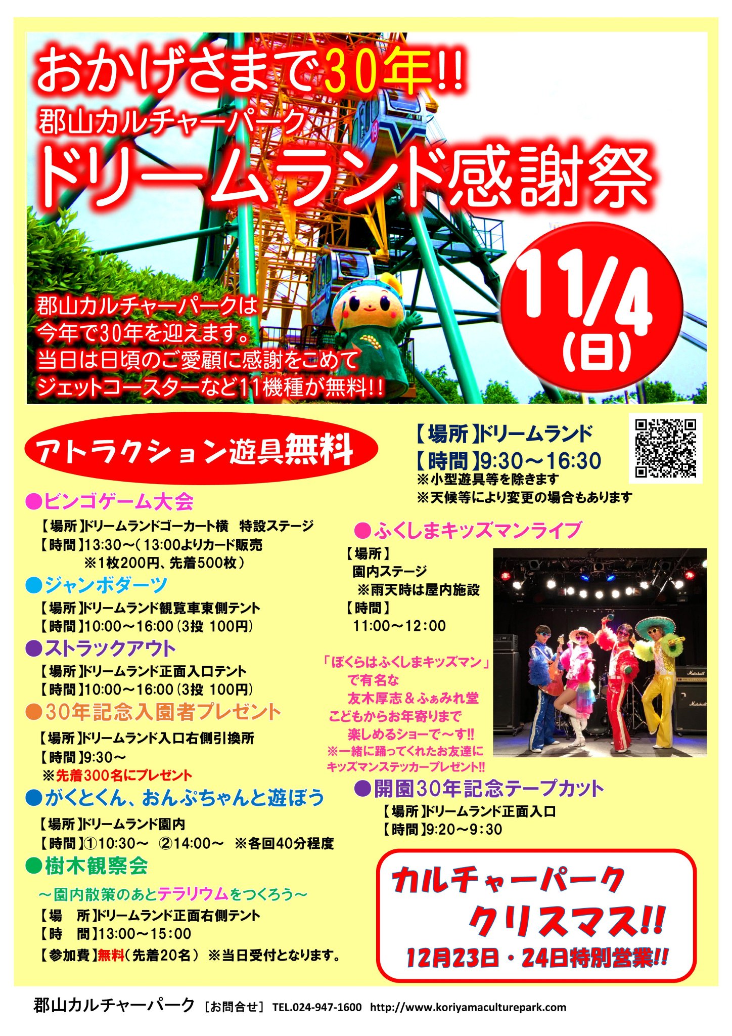 郡山カルチャーパーク 公式 Twitterissa ドリームランド感謝祭 開園30年記念 30年記念テープカットも終わり イベント開催中です 本日は 16時30分までアトラクション11機種が無料で乗り放題です 郡山市 遊園地 イベント ふくしまキッズマン