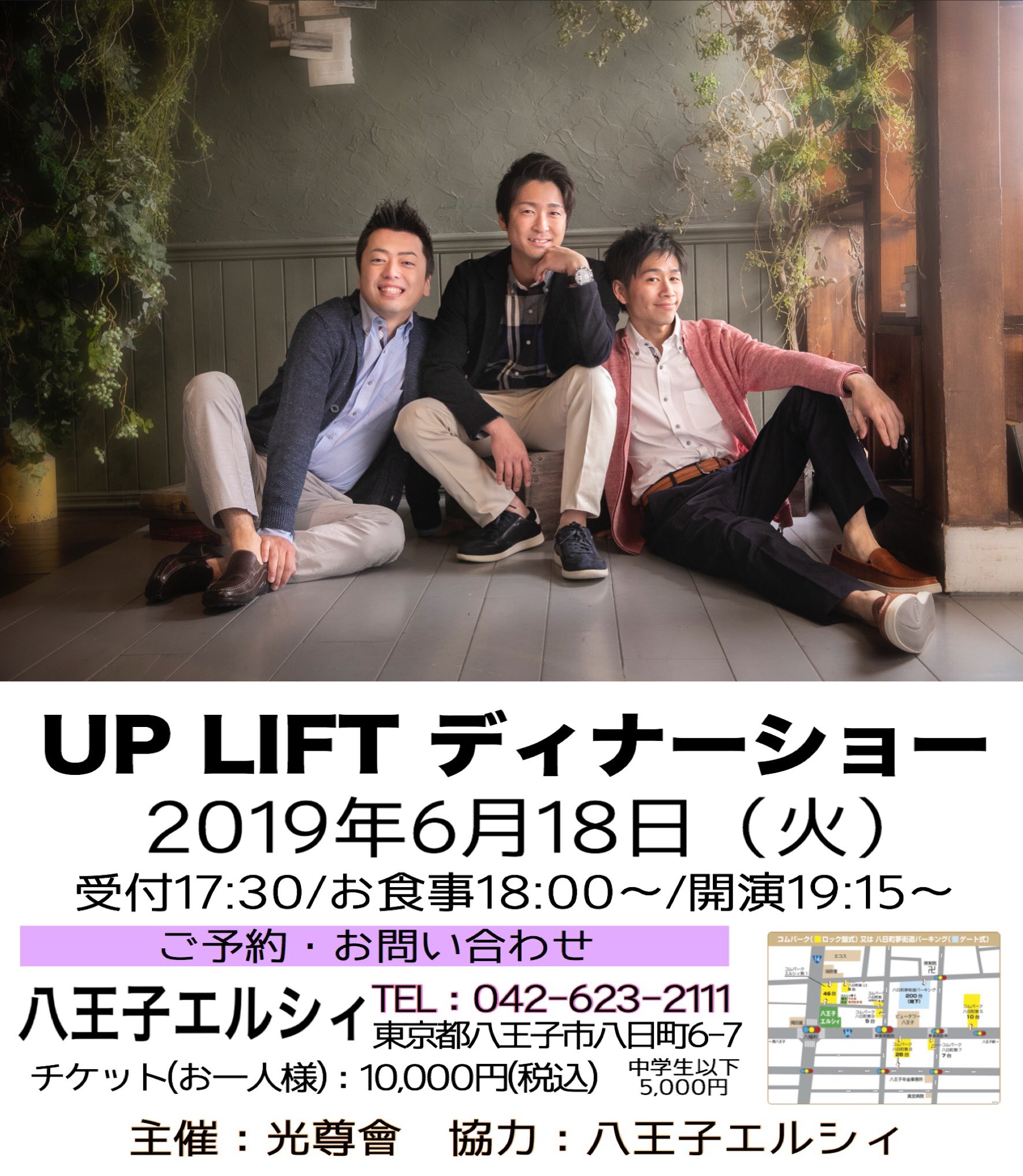 Up Lift アップリフト 公式 On Twitter 告知解禁 どどどーーーん Uplift ディナーショー 2019年6月18日 火 場所 八王子エルシィ 主催 光尊会 受付開始 17 30 お食事 18 00 開演 19 15 チケット代 10 000 税込 Uplift 八王子エルシィ